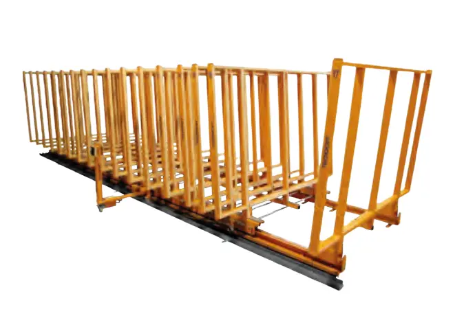 Sistema de almacenaje con capacidad para 2 posiciones en cada caballete de hojas de hasta 3300mm x 2600mm, en unidades o paquetes.