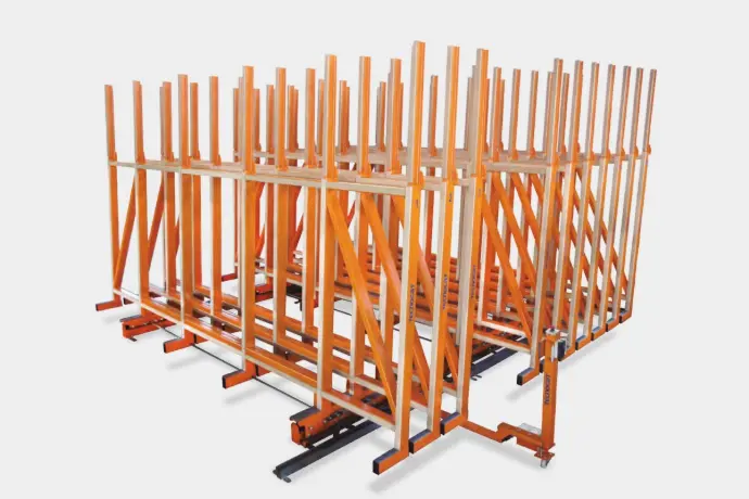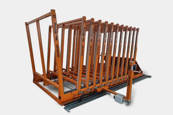 CLA is the motorized semi-automatic system for sorting and storing glass sheets or other materials, up to 3700mm x 2600mm, in units or packages, that optimizes warehouse space in the factory, improving mobility and production.