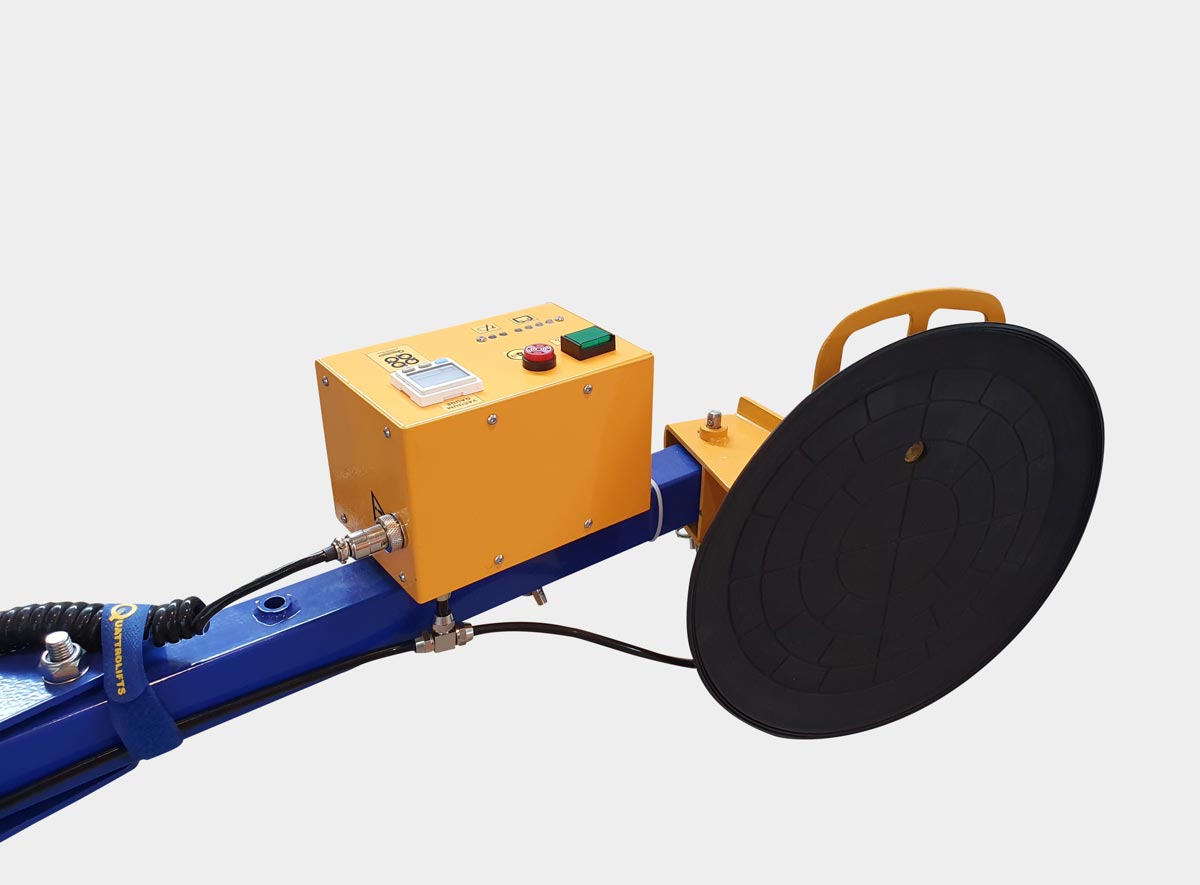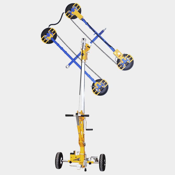 It has 360° manual rotation, Side Shift devide to move the load to the sides, and side tilting of the grid to allow the glass sheet to pass through doors.
