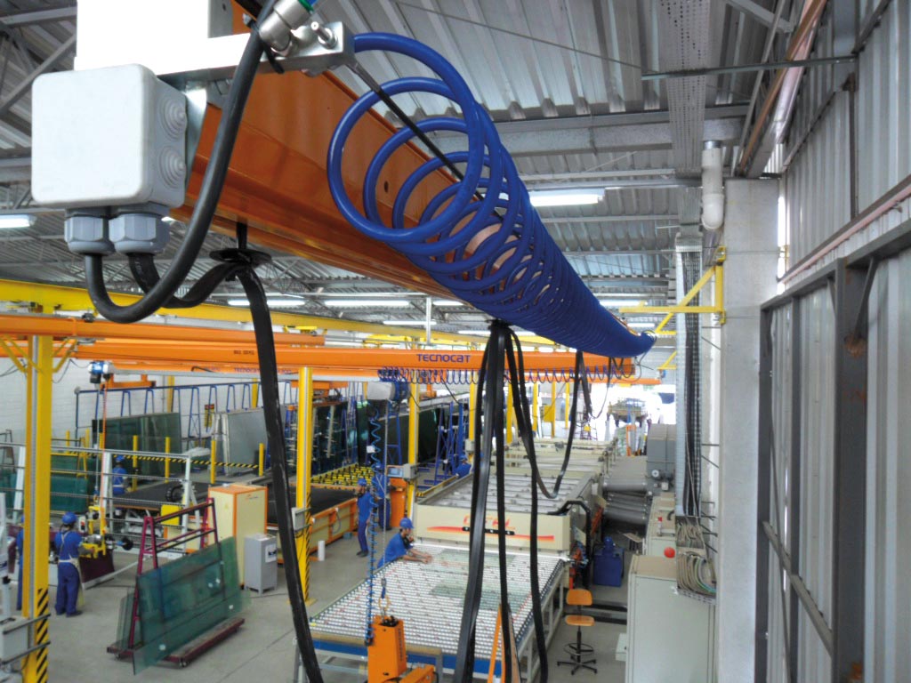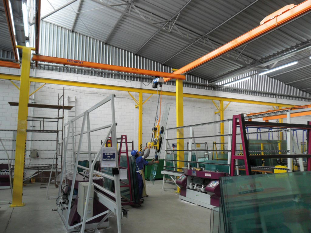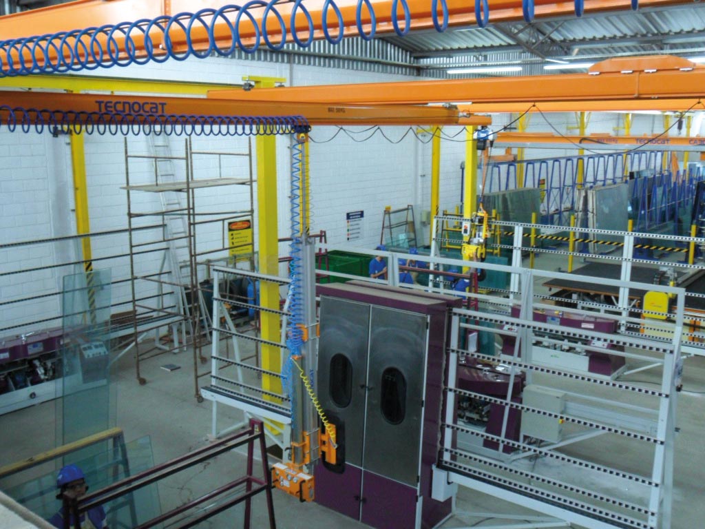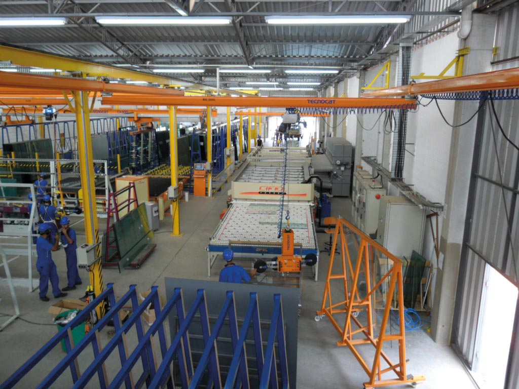 It is a perfect lifting system to work in any work area in the factory, that is, processing lines that require agility of movements on a wide work area with perfect working comfort for the operator. For this reason it is ideal for working in loading and unloading areas, edger machines, entrance and exit double glazing lines, CNC, laminating lines, entrance and exit of tempering furnaces, cutting tables, aluminum assembly for windows and doors, washing machines, etc.