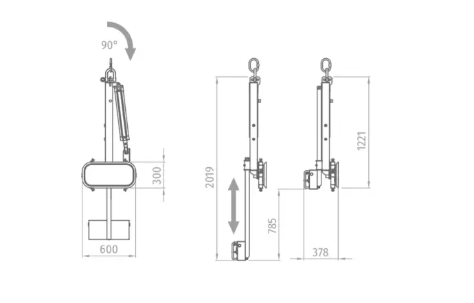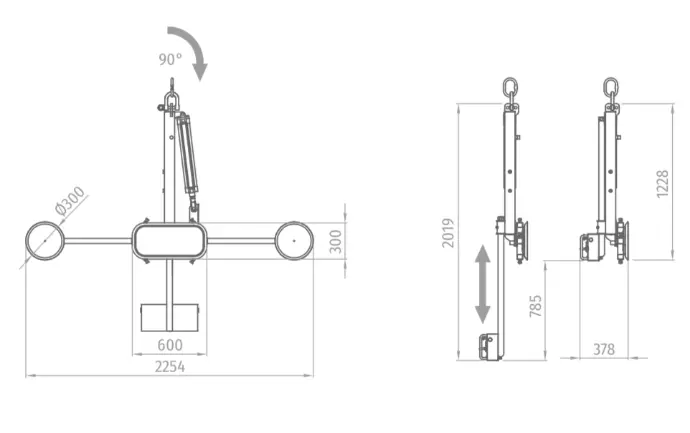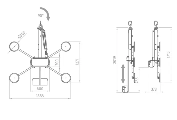 Light equipment with pneumatic rotation 0° - 90° specially suitable for vertical glass handling processes such as edger machines, vertical CNC, vertical washing machines, handling and assembly of doors and windows ...