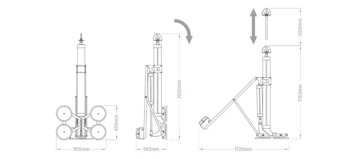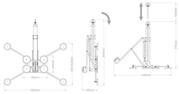 Light equipment with pneumatic tilting 0°-90° specially suitable for horizontal glass handling processes such as horizontal CNC machines, laminate glass lines, tempering furnaces, horizontal assembly of doors and windows, cutting tables ...