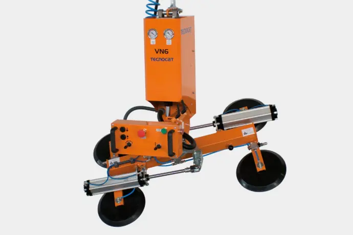 Pneumatic vacuum equipment, ideal for working on edger machines, CNC and vertical processes that only require glass rotation. 0-90° manual rotation. Capacity up to 400Kg. Elevation by means of hoist (not included). Compatible with ELEVATION SYSTEMS lifting equipment.