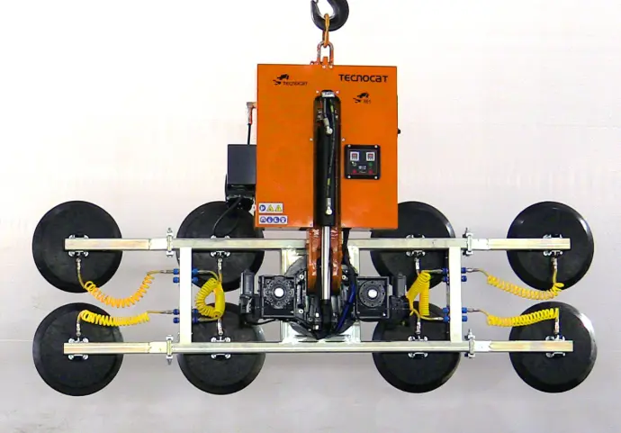 Special suction equipment for large formats of flat glass. Battery powered and electric multi tension connection. Motorized rotation and tilting. All functions controlled by means of wireless control pushbutton MI-14A. Capacity up to 1500Kg (EN-13155). Compatible with counterweight CMDB.