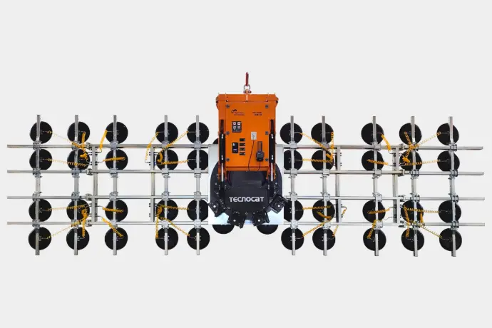 Special suction equipment for large formats of flat and curved glass. Battery powered and electric multi tension connection. Motorized rotation and tilting. All functions controlled by means of wireless control pushbutton MI-14A. Capacity up to 2500Kg (EN-13155). Compatible with counterweight CMDB..
