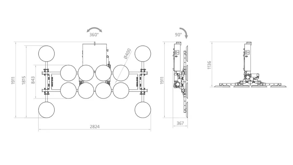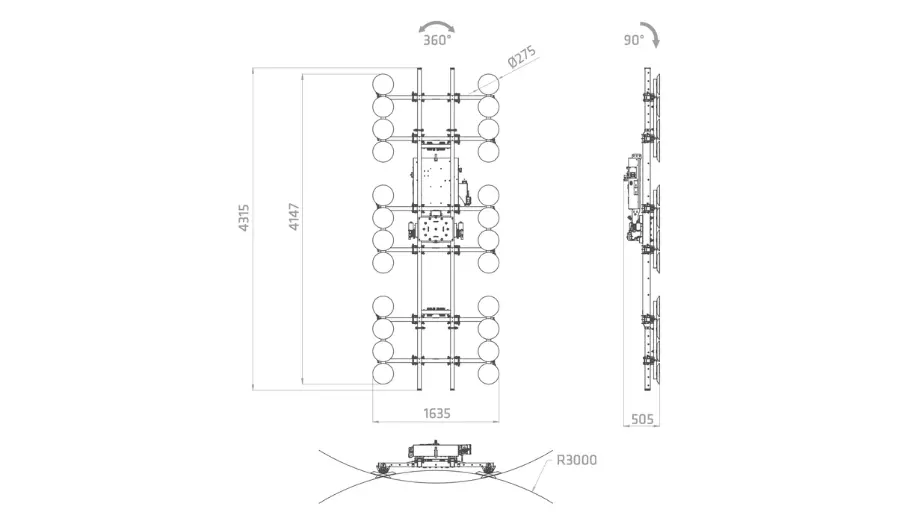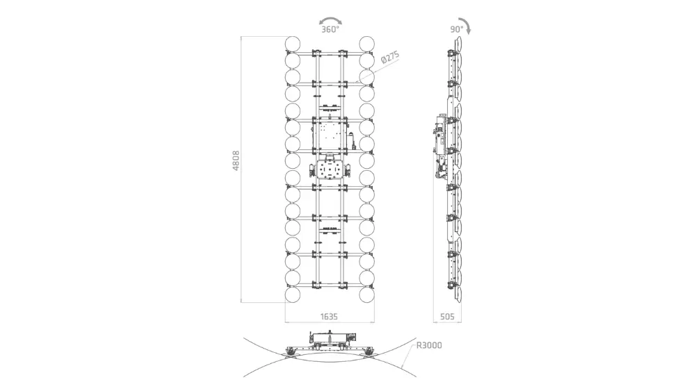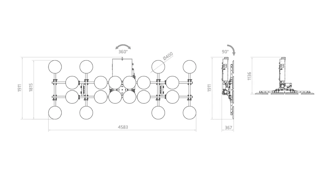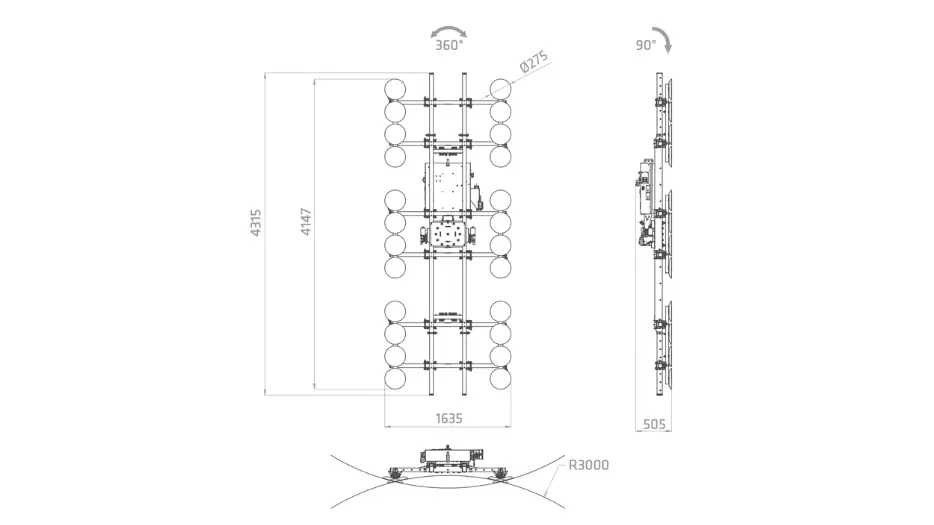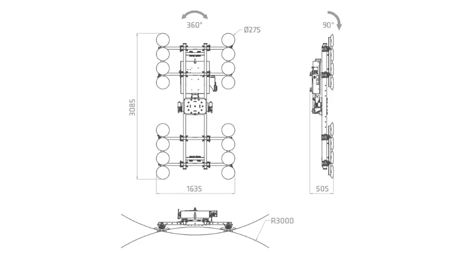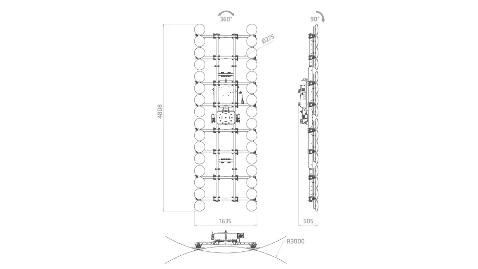 Incorpora movimientos completamente motorizados de rotación 360° y basculación de 0° a 90°, lo que facilita una manipulación fluida, precisa y segura durante todo el proceso de instalación.