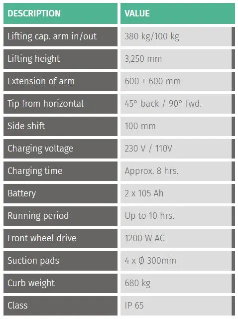 The suction cup grill rotates 360° manually and can be tilted to the side to help going through doors and narrow areas. The rest of the movement, lifting and extension of the arm and tilting of the suction cup grid are electric and they are operated from the control pushbutton.