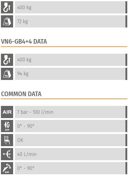 Four central vacuum cups provides great suction which allows loading up to 400Kg. Adding the extensions (model VN6-GB4+4) allows to increase the grip surface for larger sheets.